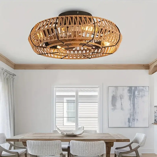 Ventilateur de Plafond LED avec Abat-Jour en Rotin Tressé – Éclairage Intégré et Télécommande pour Ambiance Naturelle