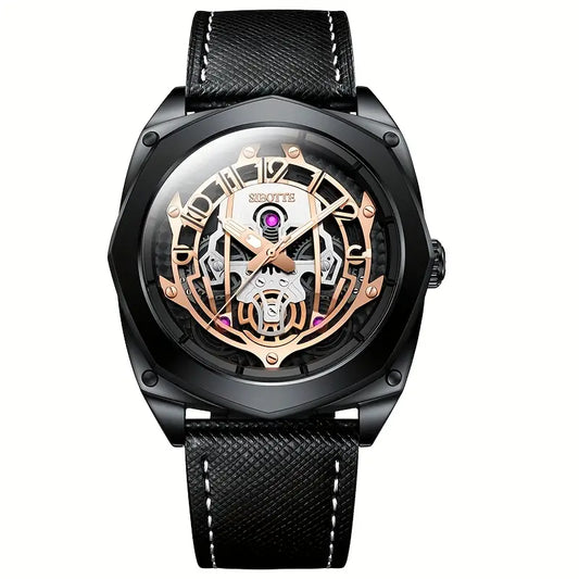 Montre homme automatique squelette – Design mécanique noir et or rose avec bracelet cuir