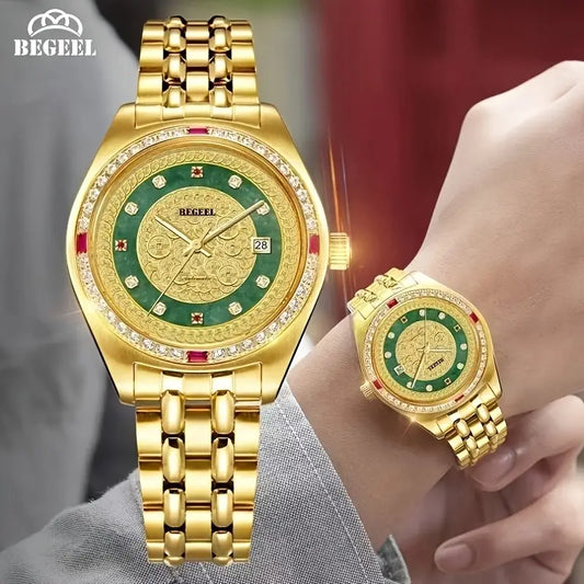 Montre homme luxe dorée – Bracelet acier or avec cadran vert et incrustations brillantes