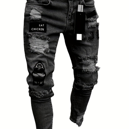 Jean en denim extensible slim fit style hip-hop - Détails usés, badges déchirés