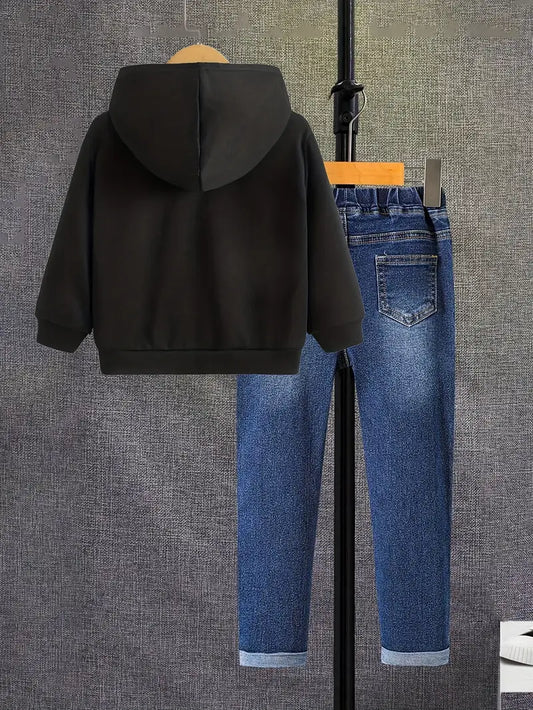 Ensemble Garçon Décontracté – Sweat à Capuche Noir et Jean Classique Bleu