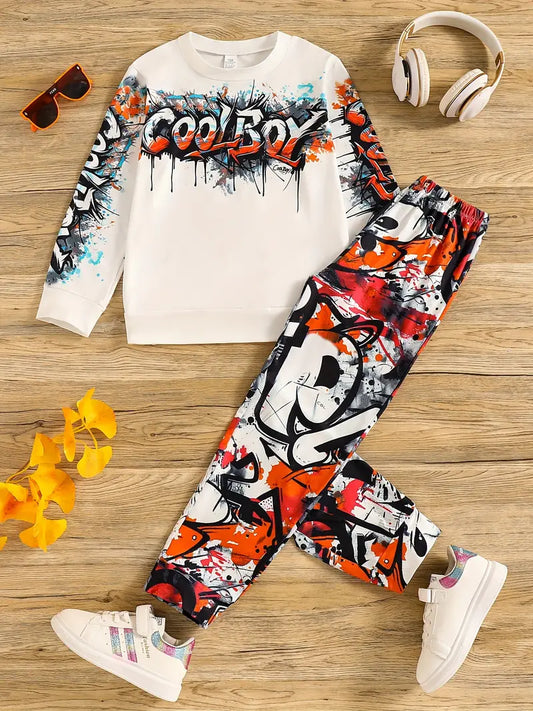 Ensemble Garçon Streetwear – Sweat Blanc et Pantalon Graffiti Coloré