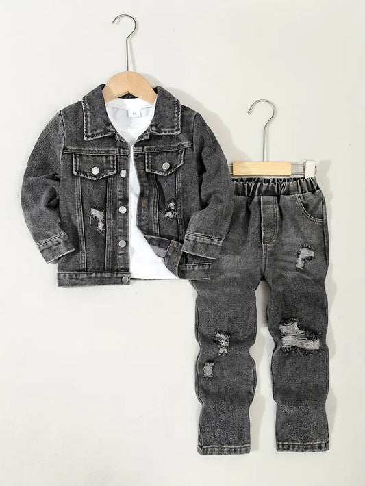 Ensemble Garçon Jean Noir – Veste en Denim + Pantalon Déchiré Style Décontracté