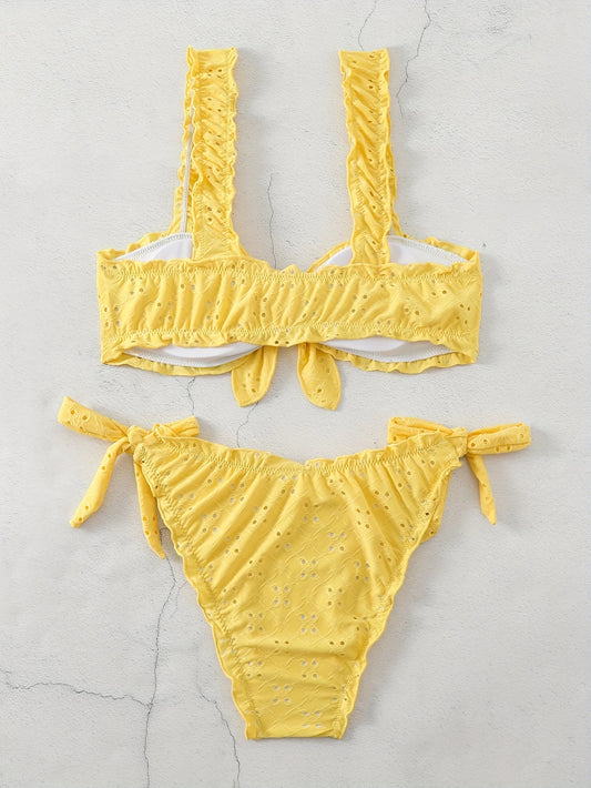 Bikini brodé avec volants – Haut à larges bretelles et culotte nouée ajustable