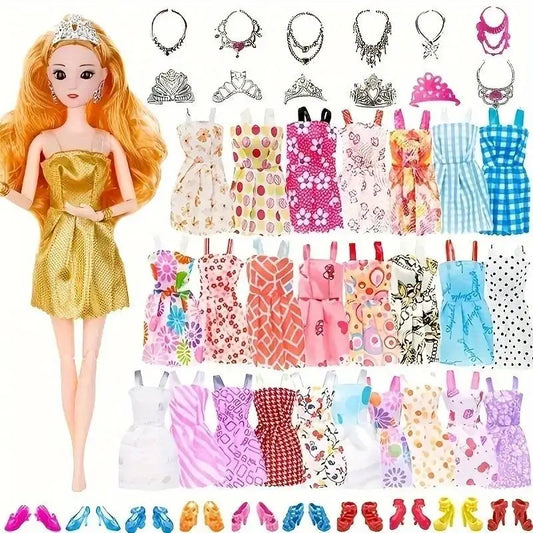 Lot de Vêtements et Chaussures pour Poupées – 24 Robes Colorées + 32 Paires de Chaussures Accessoires Mode