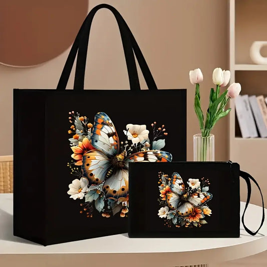 Lot de sacs à main femme Cabas et pochette motif papillons et fleurs élégantes