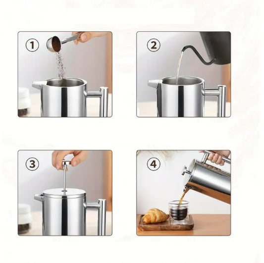 Cafetière à Piston Inox 1L – French Press Isotherme avec Filtres de Rechange et Cuillère Doseuse