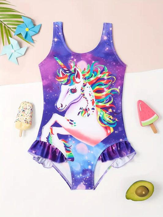 Maillot de bain fille une pièce licorne – Maillot violet arc-en-ciel avec volants