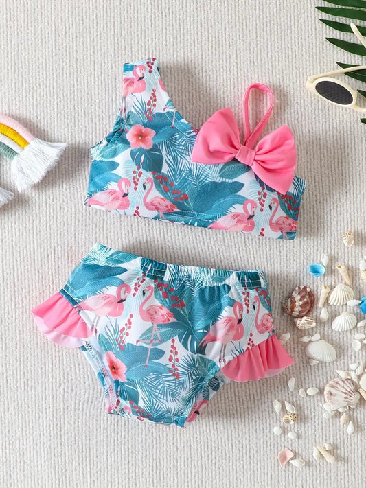 Maillot de bain fille deux pièces sirène – Bikini écailles multicolores avec volants roses