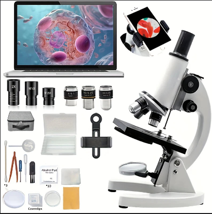 Microscope Professionnel Complet avec Accessoires – Grossissement jusqu’à 1600X, Compatible Smartphone & PC