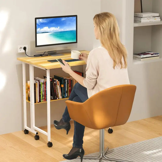 Bureau Informatique Compact avec Roulettes – Table d’Ordinateur Portable avec Étagère de Rangement