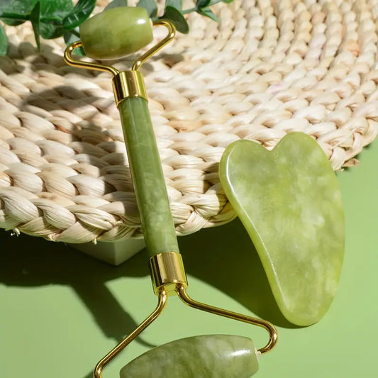 Kit Roller Visage et Gua Sha en Pierre de Jade – Massage Liftant, Drainage Lymphatique et Éclat Naturel