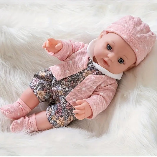 Poupée bébé réaliste 30 cm avec vêtements fleuris et bonnet rose/marron – Idéal jeu d’imitation et cadeau enfant