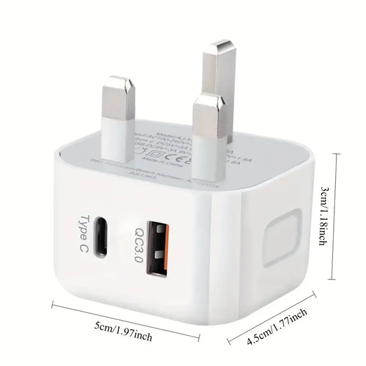 Chargeur mural rapide USB Type-C + QC 3.0 – Prise UK 18W pour smartphone, tablette et appareils électroniques
