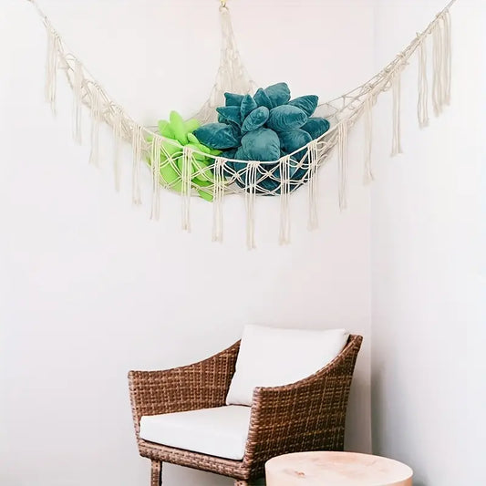 Filet de Rangement Suspendu en Macramé – Hammac de Rangement pour Peluches, Jouets et Accessoires Bébé