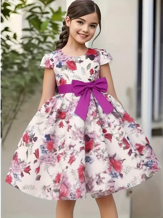 Robe fille élégante à fleurs multicolores – Robe de cérémonie avec grand nœud violet