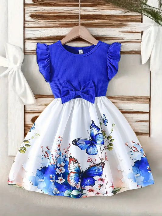 Robe fille été bleu et blanc à volants – Imprimé papillons et fleurs avec nœud