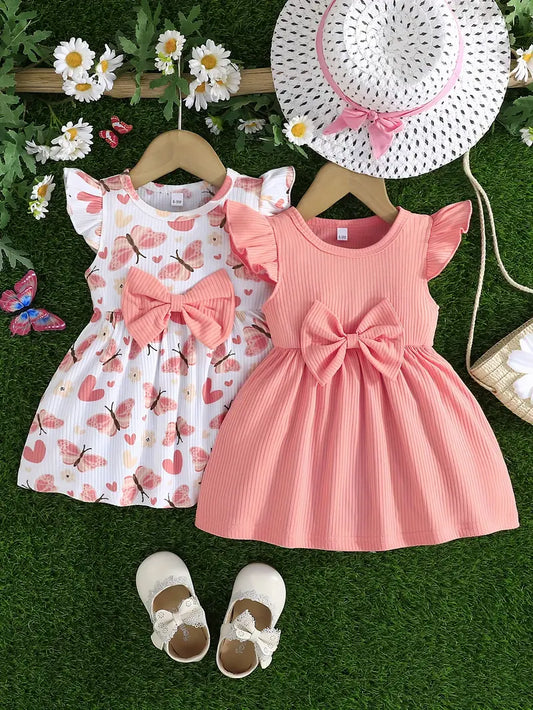 Lot de 2 robes fille été avec nœud – Robe lilas unie et robe blanche à fleurs papillons