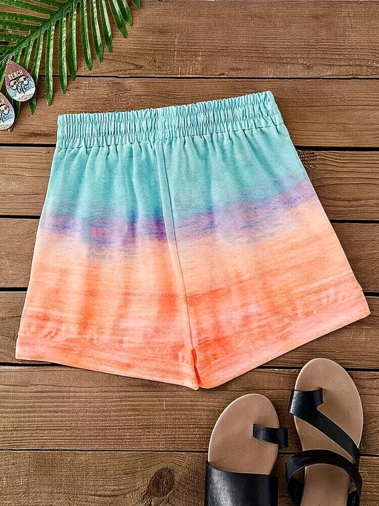 Short de Plage Femme Dégradé Sunset – Taille Élastique, Palmier & Message "Live Simply"
