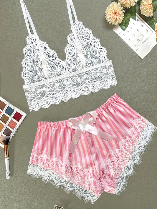 Ensemble Lingerie Femme Satin Rayé et Dentelle – Sous-vêtements et Pyjamas Sexy 2 Pièces Bralette & Short