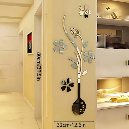 Sticker mural miroir vase floral 3D – Décoration murale effet miroir 80x32 cm pour salon, entrée ou couloir