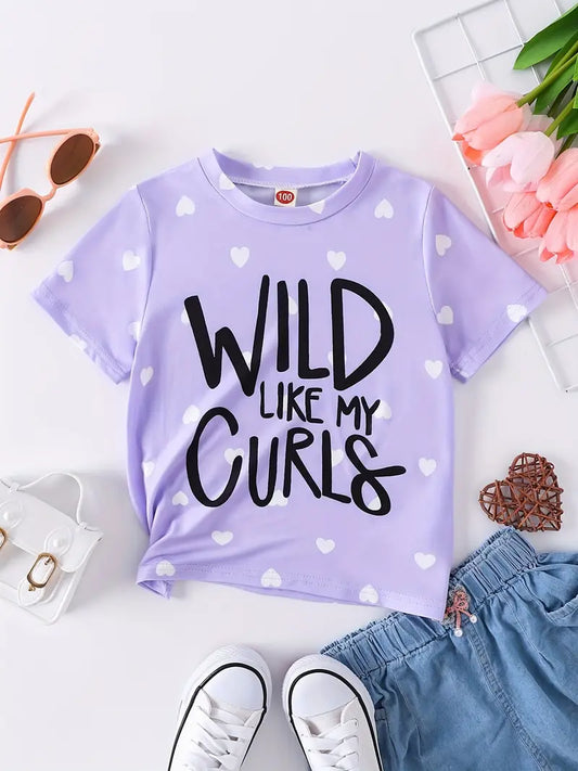 T-shirt Fille Violet à Cœurs – Haut Enfant Message ‘Wild Like My Curls’ Tendance Été