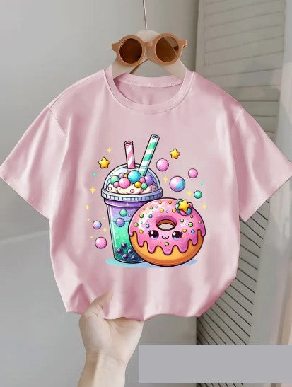 T-shirt fille blanc imprimé kawaii – Donut & Bubble Tea colorés