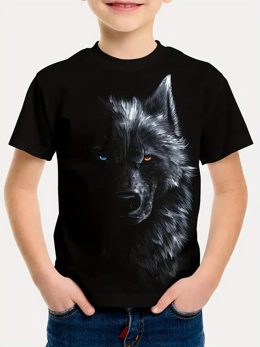 T-shirt Garçon Noir Motif Loup 3D – Haut Imprimé Animal Sauvage Mode Streetwear Enfant