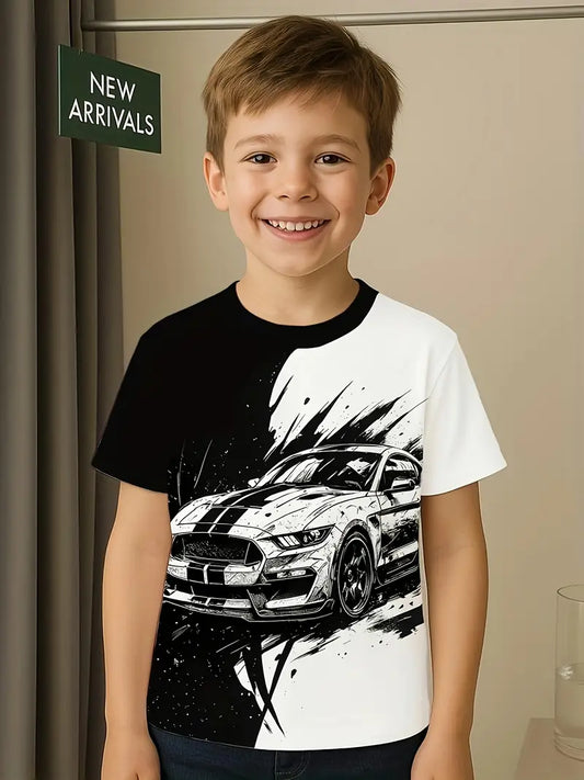 T-shirt Garçon Noir et Blanc avec Voiture de Sport – Mode Streetwear Enfant Confortable et Stylé