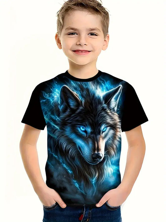 T-shirt Garçon Motif 3D Loup et Tigre – Haut Imprimé Animal Fantastique Mode Streetwear Enfant