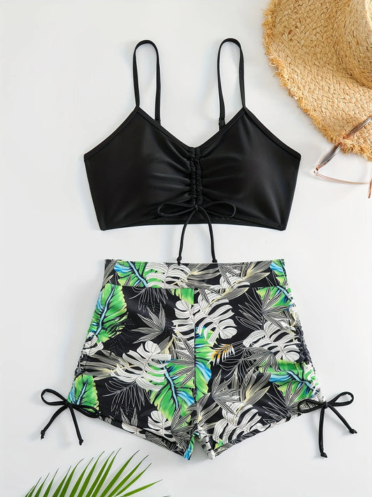 Ensemble de Plage Femme 2 Pièces – Haut Froncé et Short Imprimé Tropical