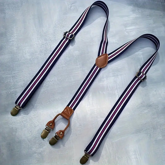 Bretelles homme à rayures rétro ajustables – Style vintage élégant avec attaches métalliques et cuir marron