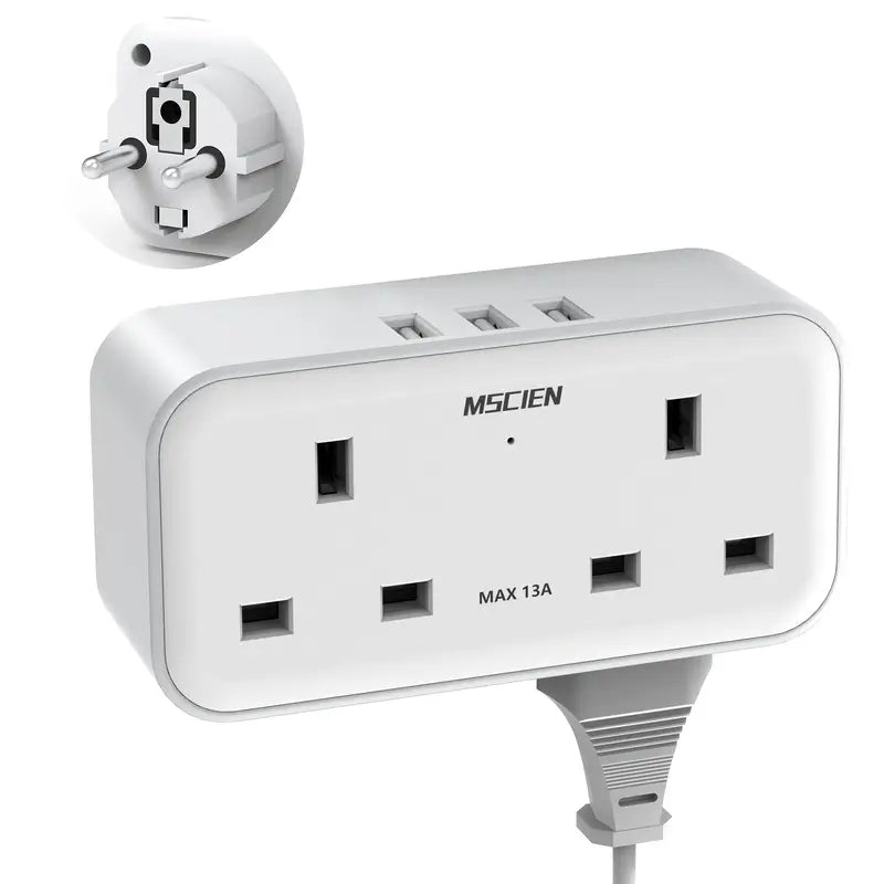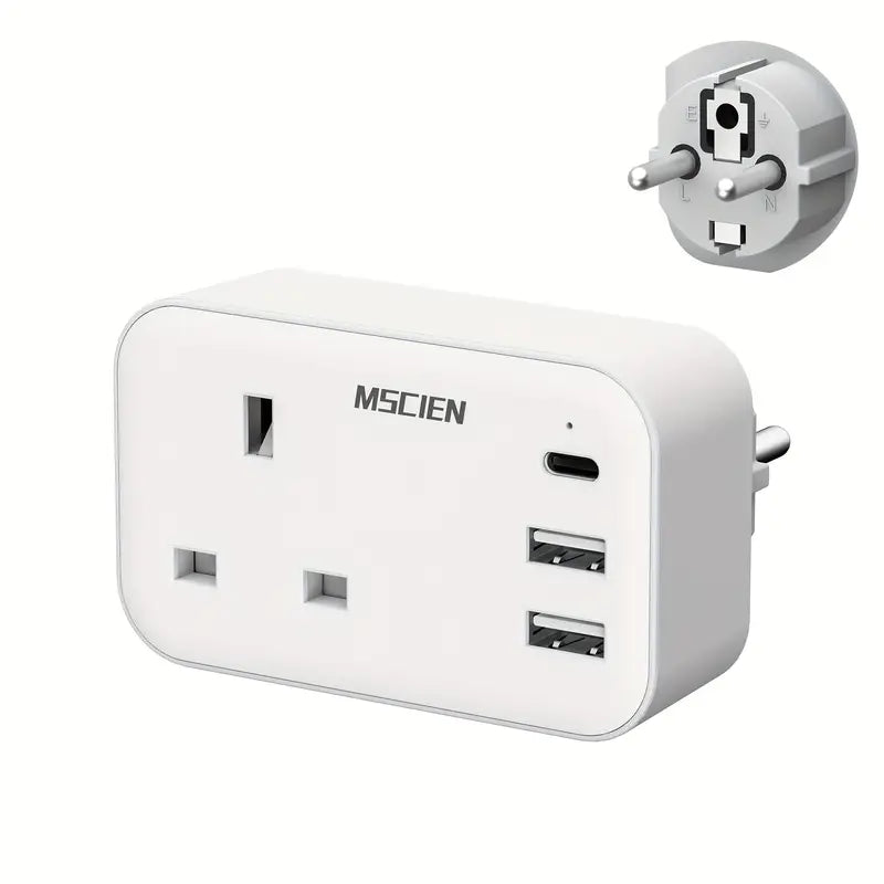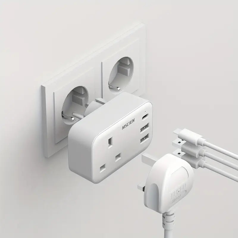 Voyagez léger et restez connecté avec l’adaptateur prise murale universel MSCIEN. Il convertit instantanément une prise européenne (Type C/E/F) pour accueillir vos appareils à prise UK (Type G), tout en offrant 3 ports USB (1 USB‑C + 2 USB‑A) pour recharger smartphone, tablette et accessoires. Idéal pour la maison, le bureau et le voyage, son témoin LED confirme l’alimentation d’un coup d’œil.