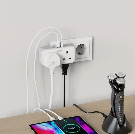 - 4‑en‑1: 1 prise UK + 1 USB‑C + 2 USB‑A sur un seul adaptateur.