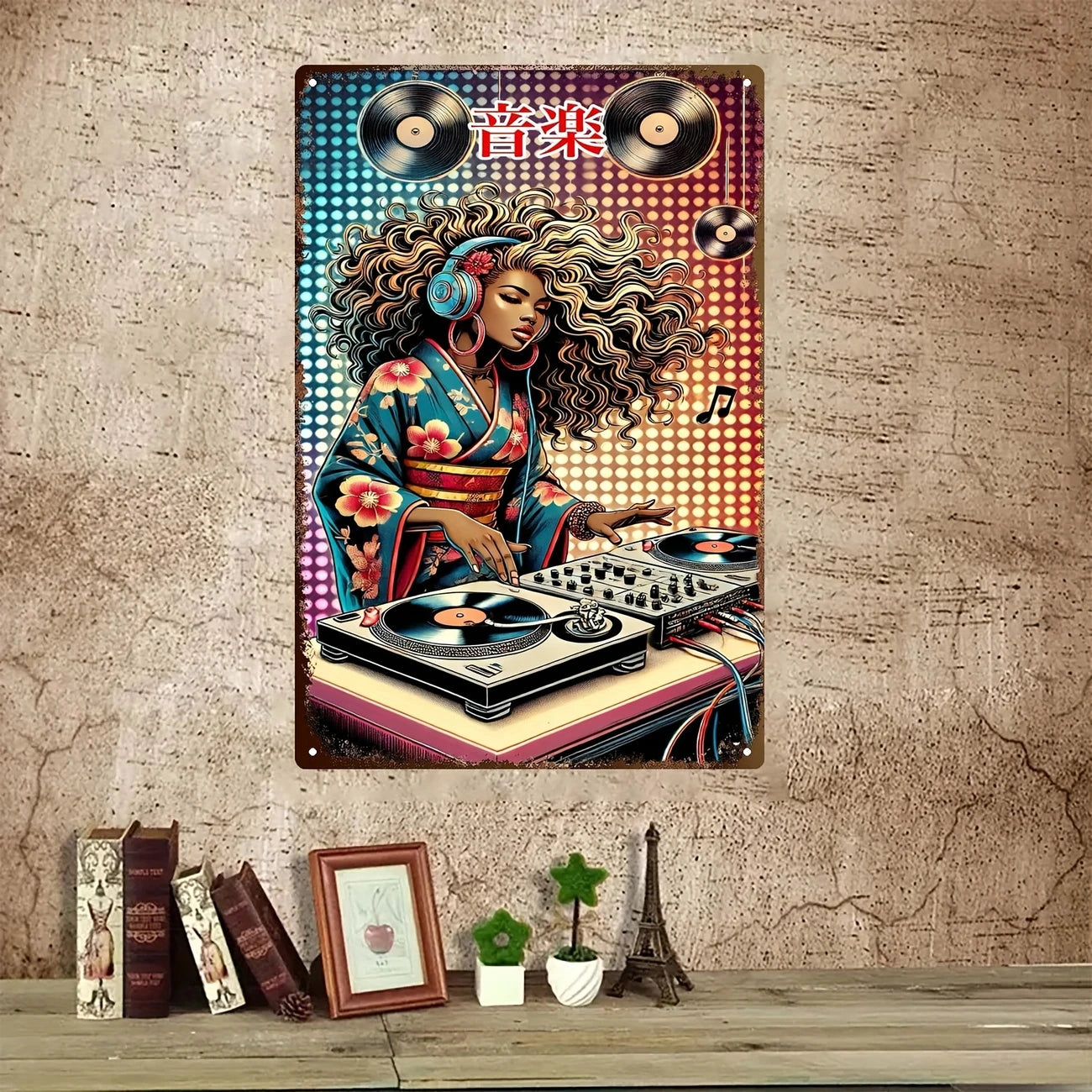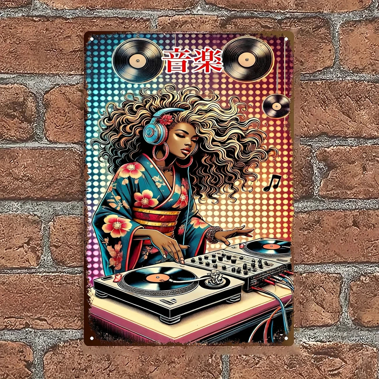 Faites vibrer vos murs avec une pièce forte: une DJ afro en kimono, casque sur les oreilles et platines prêtes à tourner, surmontée du kanji 音楽. Cette affiche métal DJ au rendu authentiquement rétro mêle culture vinyle, street art et touche nippone pour créer un point focal irrésistible dans un salon, un coin platines, un studio ou un espace pro.