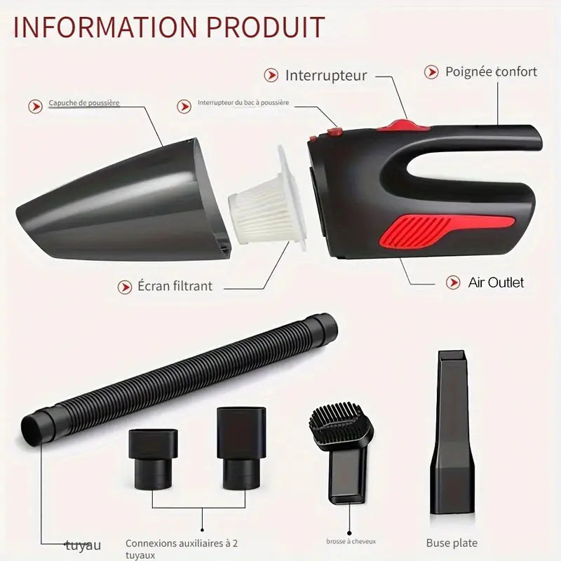 - Liberté totale: aspirateur sans fil et rechargeable USB (voiture, PC, powerbank) pour nettoyer partout.