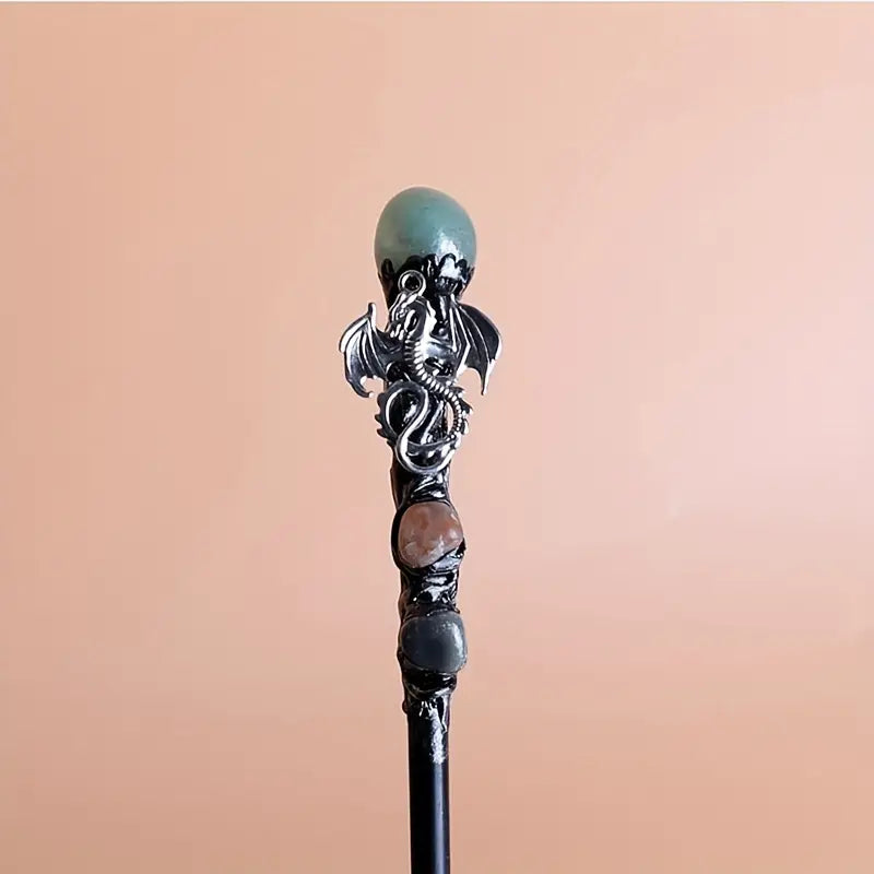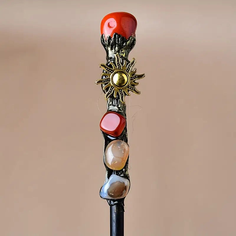 Affirmez votre style avec cette baguette magique sertie de cristaux, pensée comme un véritable accessoire de déguisement pour univers fantasy et cosplay sorcier. Inspirée des talismans anciens, sa structure lisse et équilibrée est rehaussée d’un motif soleil et de galets polis façon pierres naturelles. Elle se porte autant comme épingle coiffure chic que comme détail scénographique pour vos personnages, du quotidien aux conventions.