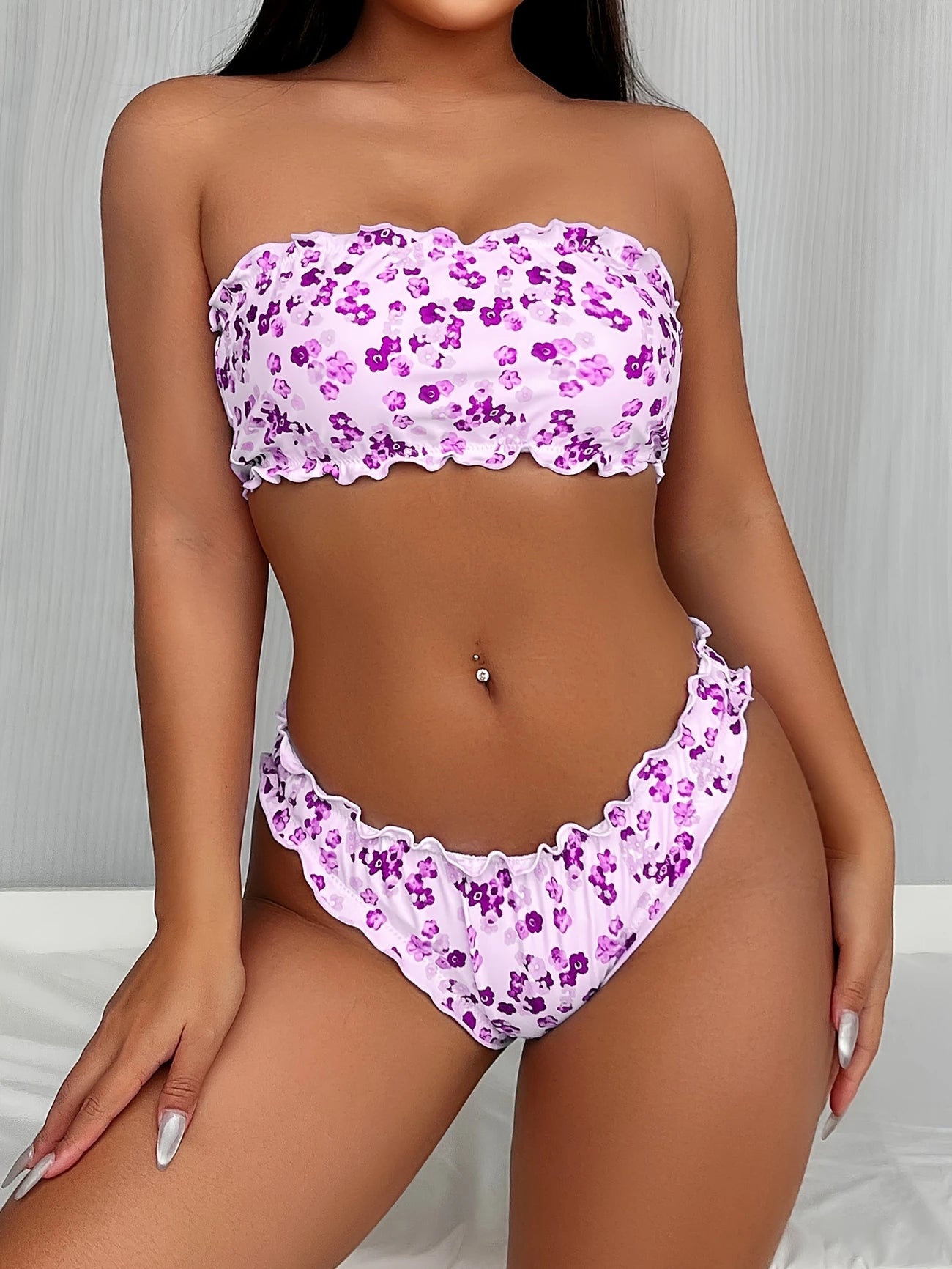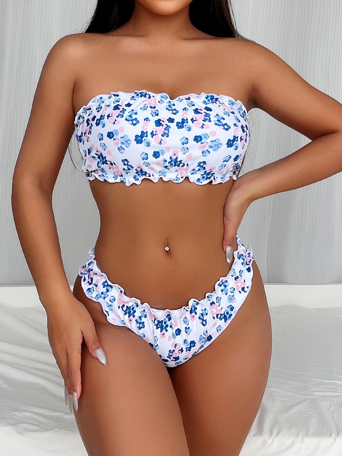 Bikini bandeau à volants avec imprimé fleuri – Style romantique et coupe échancrée