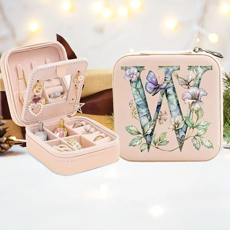 Boîte à bijoux de voyage personnalisée avec initiale florale – Étui compact pour bagues, colliers et boucles d’oreilles