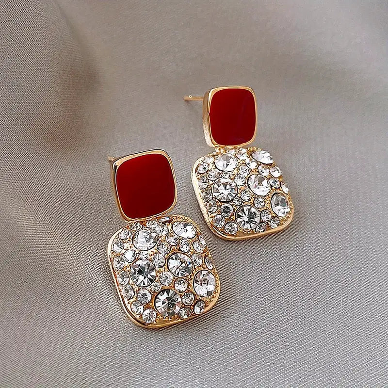 Boucles d’oreilles mariage femme – Pendants dorés avec cristaux scintillants et pierre rouge élégante
