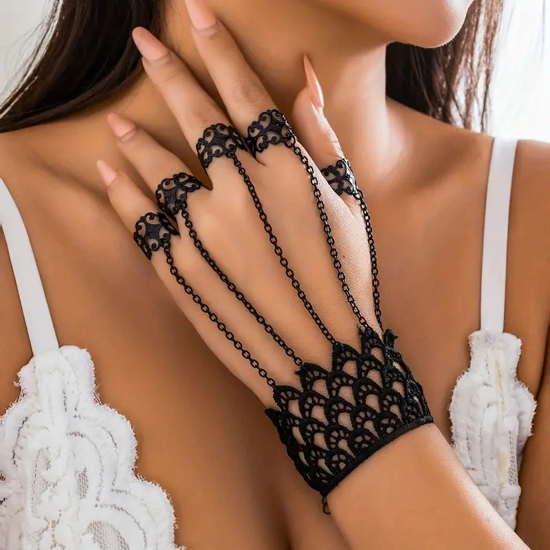 Affirmez votre style avec ce bracelet gothique de main en dentelle, sublimé par des chaînes délicates formant un véritable gant-bijou. Sa manchette en dentelle ajourée enlace le poignet, tandis que des chaînes fines descendent vers des anneaux décoratifs qui habillent chaque doigt pour un effet théâtral et ultra tendance. Idéal pour rehausser une tenue victorienne, punk ou une silhouette de soirée, de festival ou de cosplay.