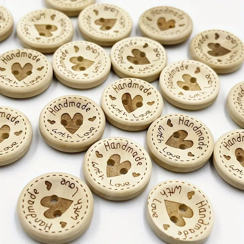 Chaque bouton affiche l’inscription “Handmade with Love” entourée de petits cœurs pour signer vos réalisations avec chaleur. Le toucher est agréable, la gravure nette, et la finition pensée pour ne pas accrocher les fils.
