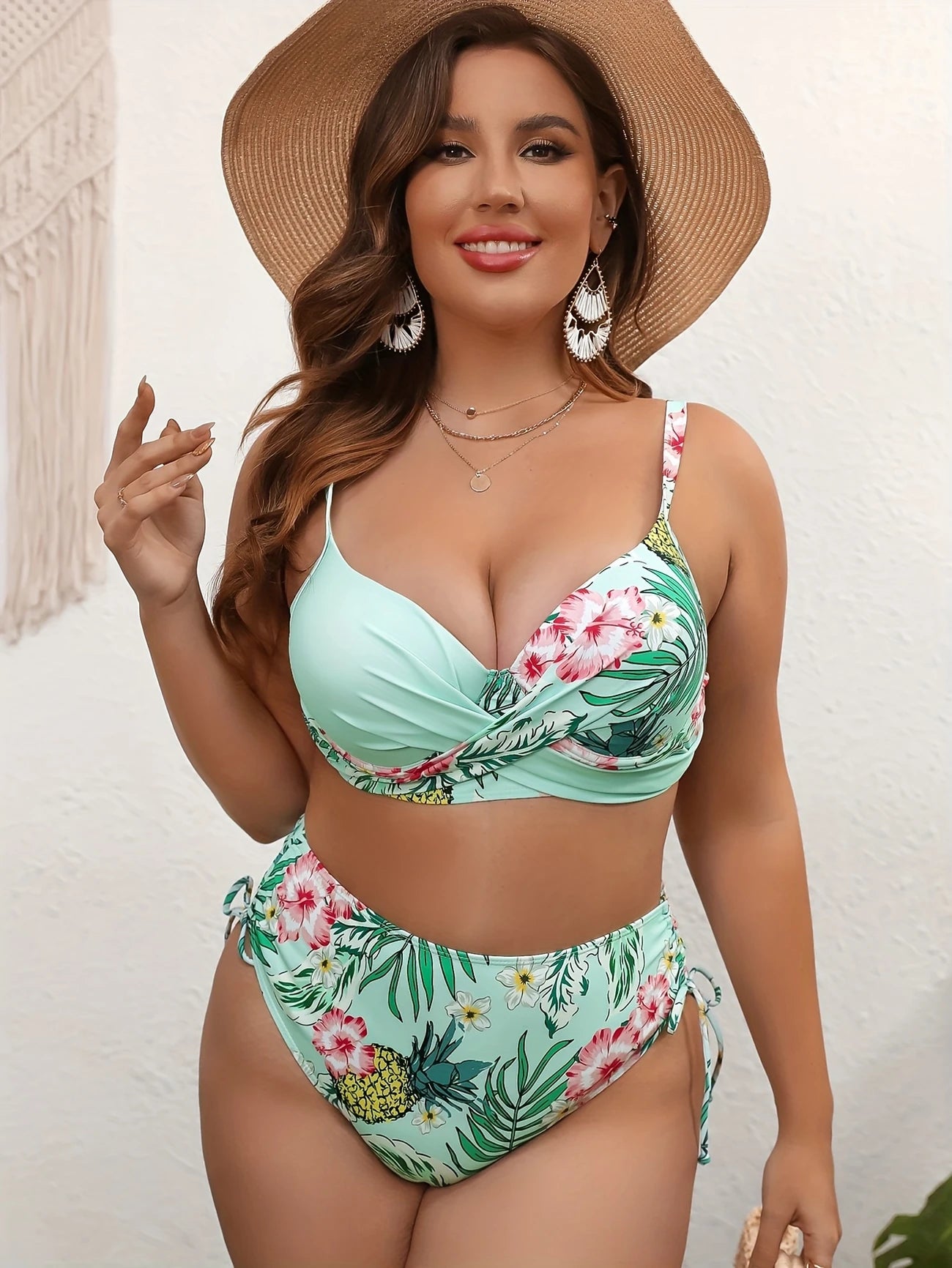 Ensemble Bikini Taille Haute Imprimé Tropical – Haut Croisé Maintien & Bas Ajustable
