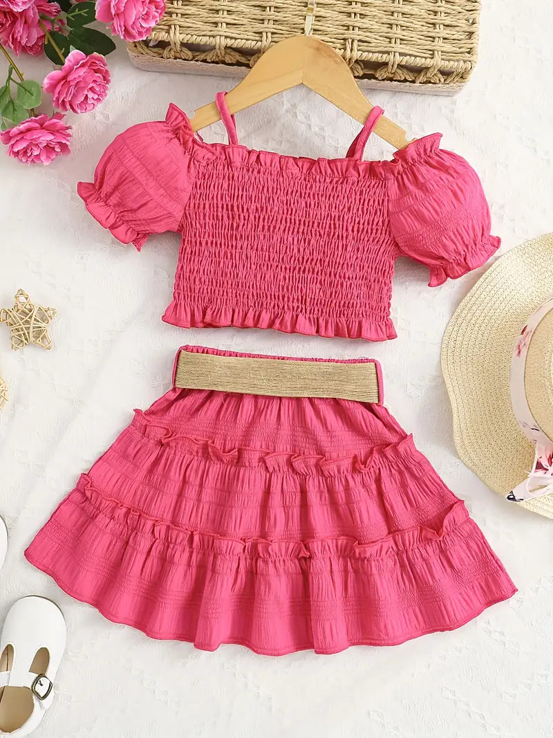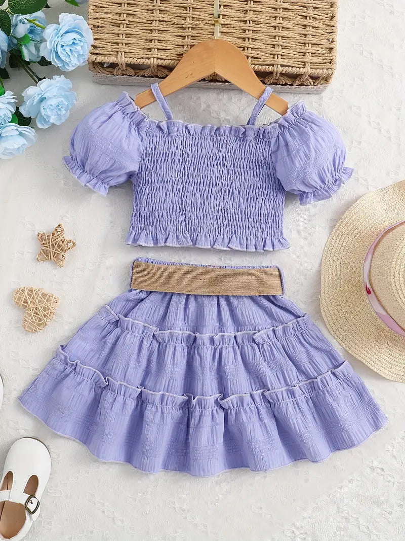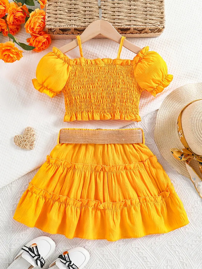 Ensemble fille été 2 pièces – Haut court à manches bouffantes et jupe volantée