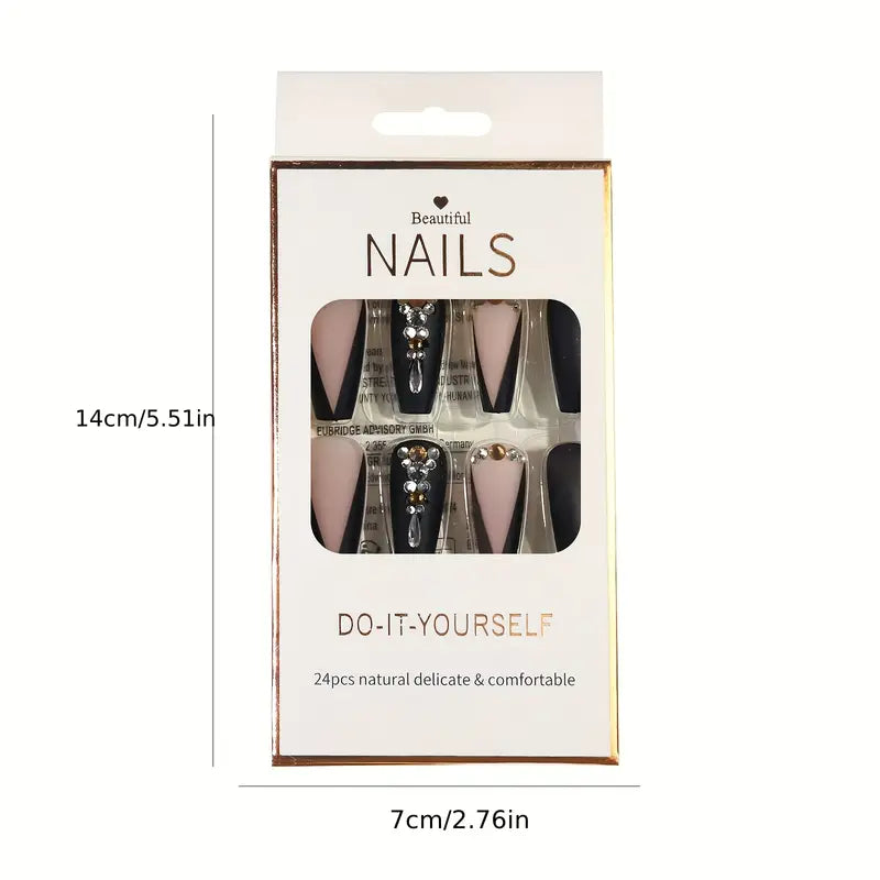 Faux Ongles Noirs et Nude Mat avec Strass – Design Pointu Élégant, Kit de 24 Pièces Prêt à Poser