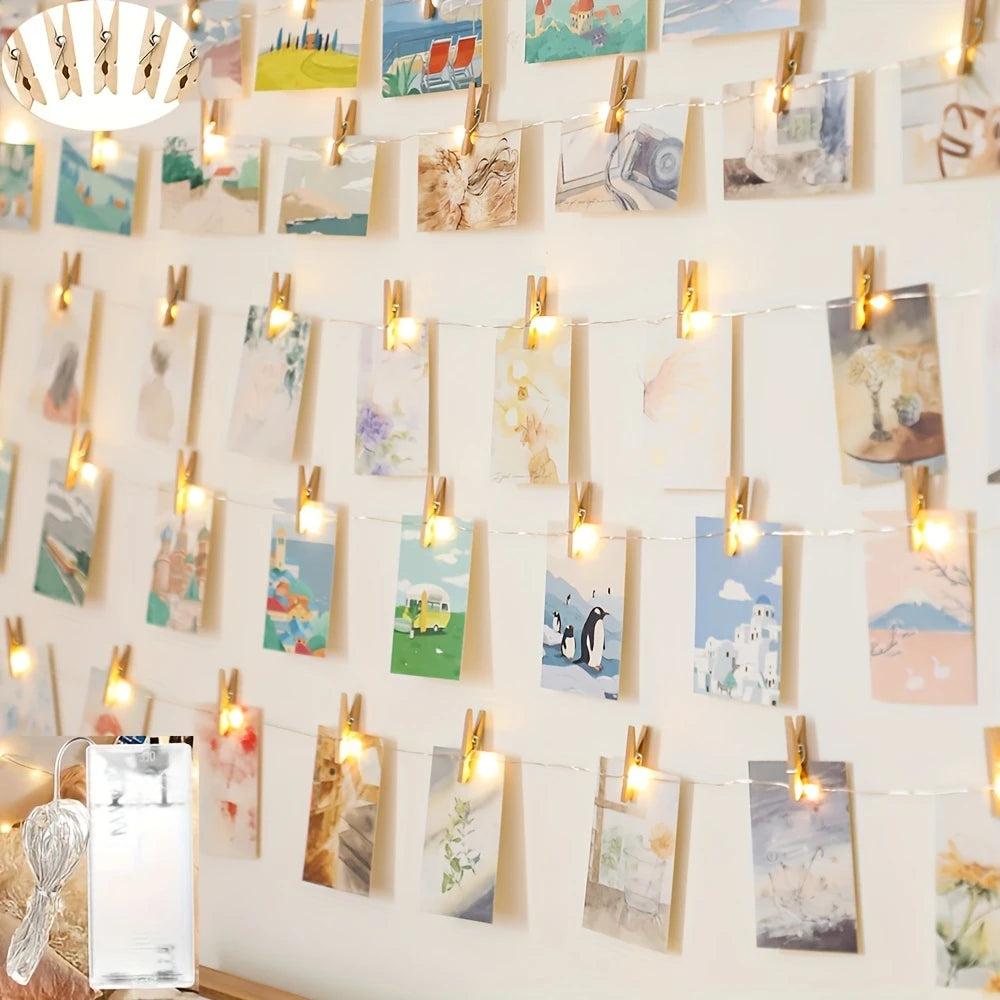 Guirlande lumineuse à pinces bois – Décoration murale photo chaleureuse et naturelle