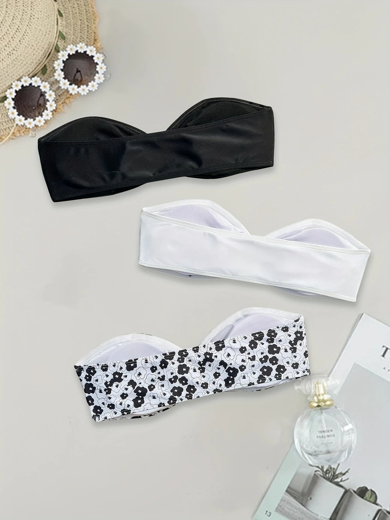Haut de Bikini Femme Bandeau – Lot de 3 avec Anneau Central, Uni & Fleuri, Sans Bretelles