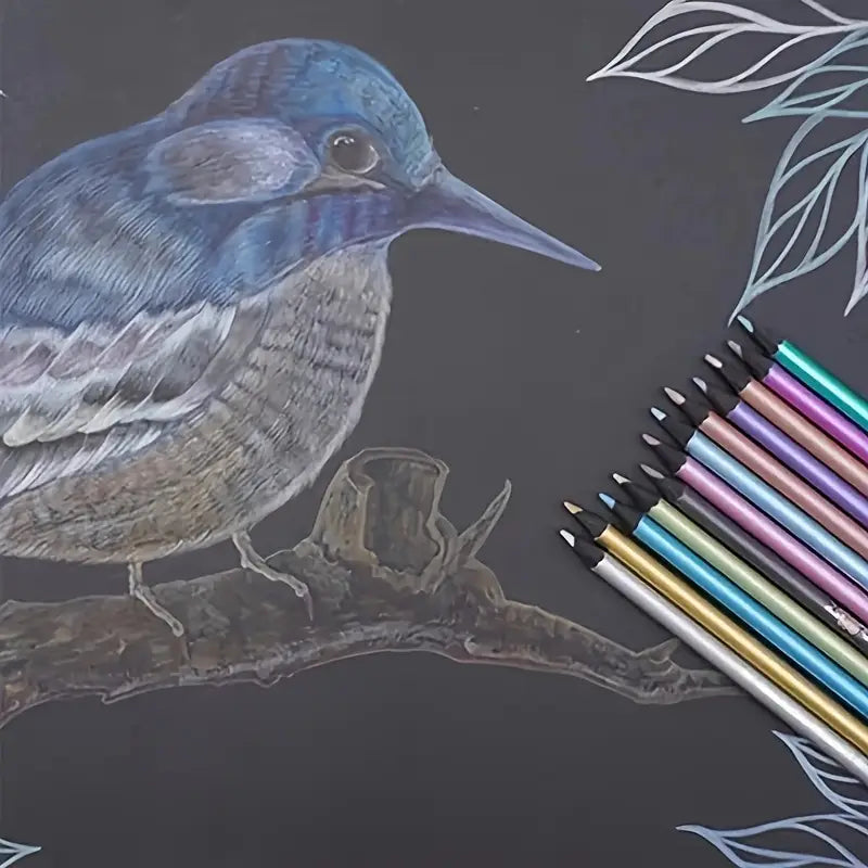 Boostez vos œuvres avec des crayons de couleur métalliques à la mine 3mm riche en pigments. Leur finition nacrée offre une couvrance intense et un effet miroir subtil, idéal pour le dessin, l’esquisse et le coloriage créatif sur papier clair comme sur papier noir. La mine glisse sans effort, dépose une couleur dense et permet des tracés nets ou des aplats homogènes, sans poussière excessive.