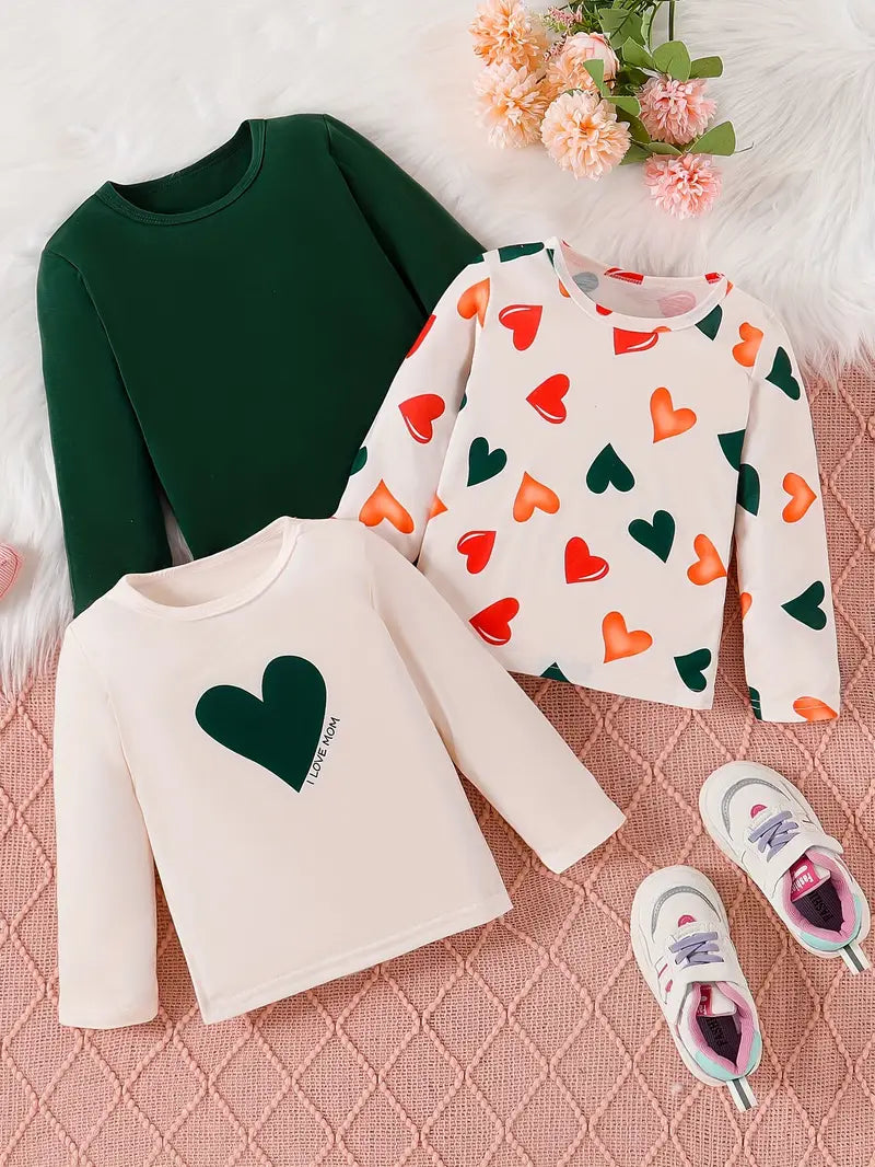 Lot de 3 hauts bébé fille manches longues – motifs cœurs et unis pour toutes saisons