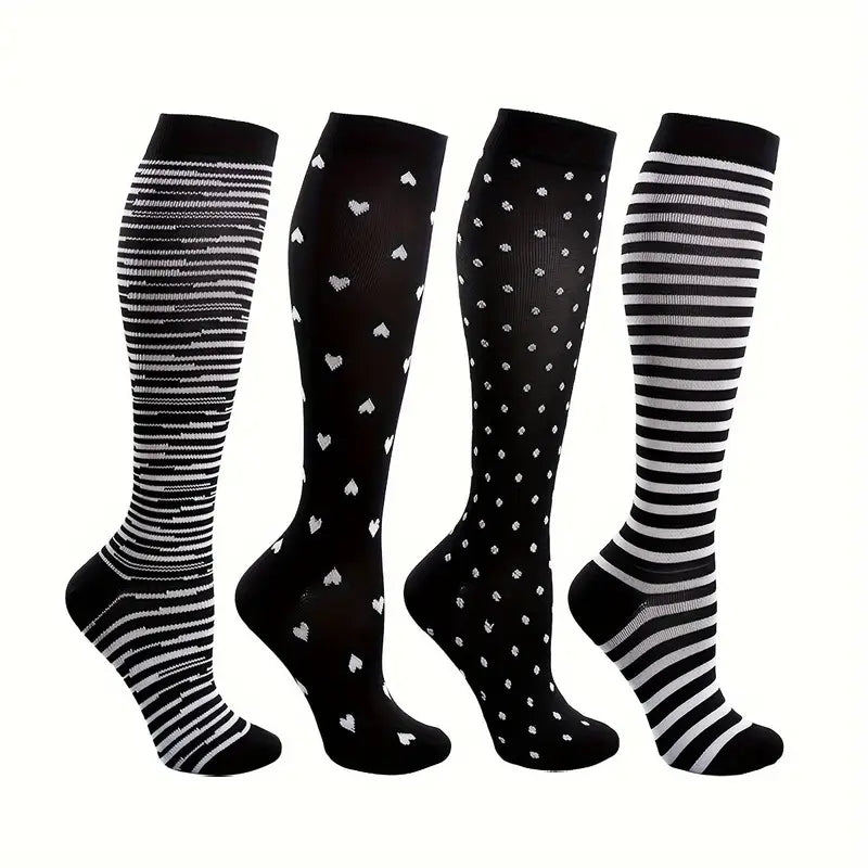 Lot de 4 paires de chaussettes hautes homme – Motifs rayures et cœurs, style fantaisie noir et blanc